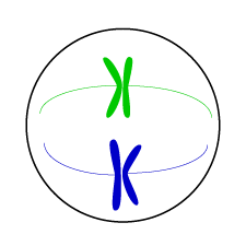 The cell divides. Each daughter cell thus has a copy of the primary genome and one strand of the secondary genome. In an egg, the auxiliary strands are not systematically pulled to either end of the cell and thus each end up in either of the daughter cells at random, independently of each other.